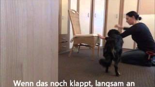 Zunächst soll der Hund lernen über den eigenen Arm zu springen. Dazu hockt man sich vor einen niedrigen Tisch oder Stuhl und legt die ausgestreckte Hand dort ab. Wichtig ist, dass der Arm beim Hund in Brusthöhe ist. Der Hund setzt sich auf eine Seite. Mit der freien Hand lockt man die Schnauze des Hundes über den Arm – beispielsweise mit einem Leckerli. Jede Annäherung des Hundes an den Arm wird am Anfang belohnt. Schritt für Schritt lockt man den Hund nun immer weiter über den Arm, bis er schließlich über den Arm klettert.