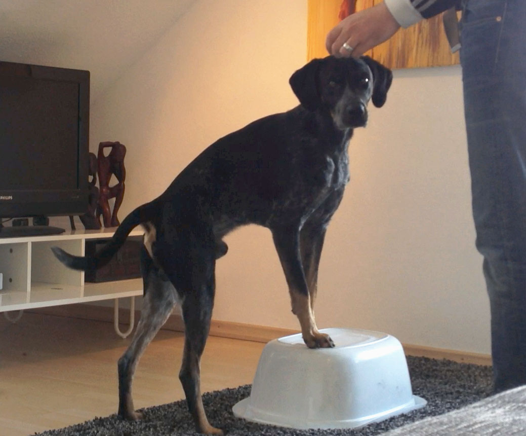 Der Hund steht mit den Vorderpfoten auf einer Box, einer umgedrehten Plastikschüssel oder ähnlichem und dreht sich mit den Hinterpfoten im Kreis um die Box herum - wie Zirkuselefanten eben.